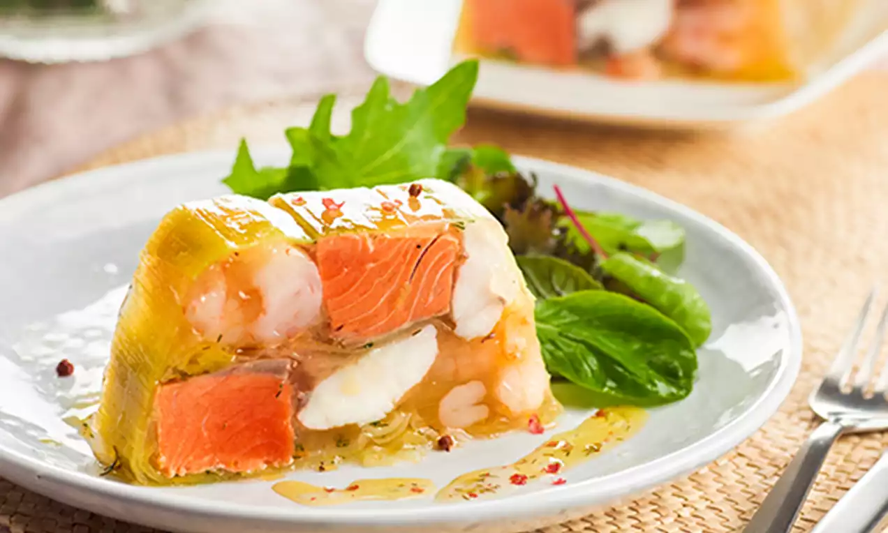 Recubrirlo con los puerros en tiras finas y rellenar con las tiras de pescado y las gambas alternando los colores.
